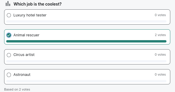 - Polls are nearly ready! If you enable this feature in labs, you can create a poll with several options, and people can vote on it.