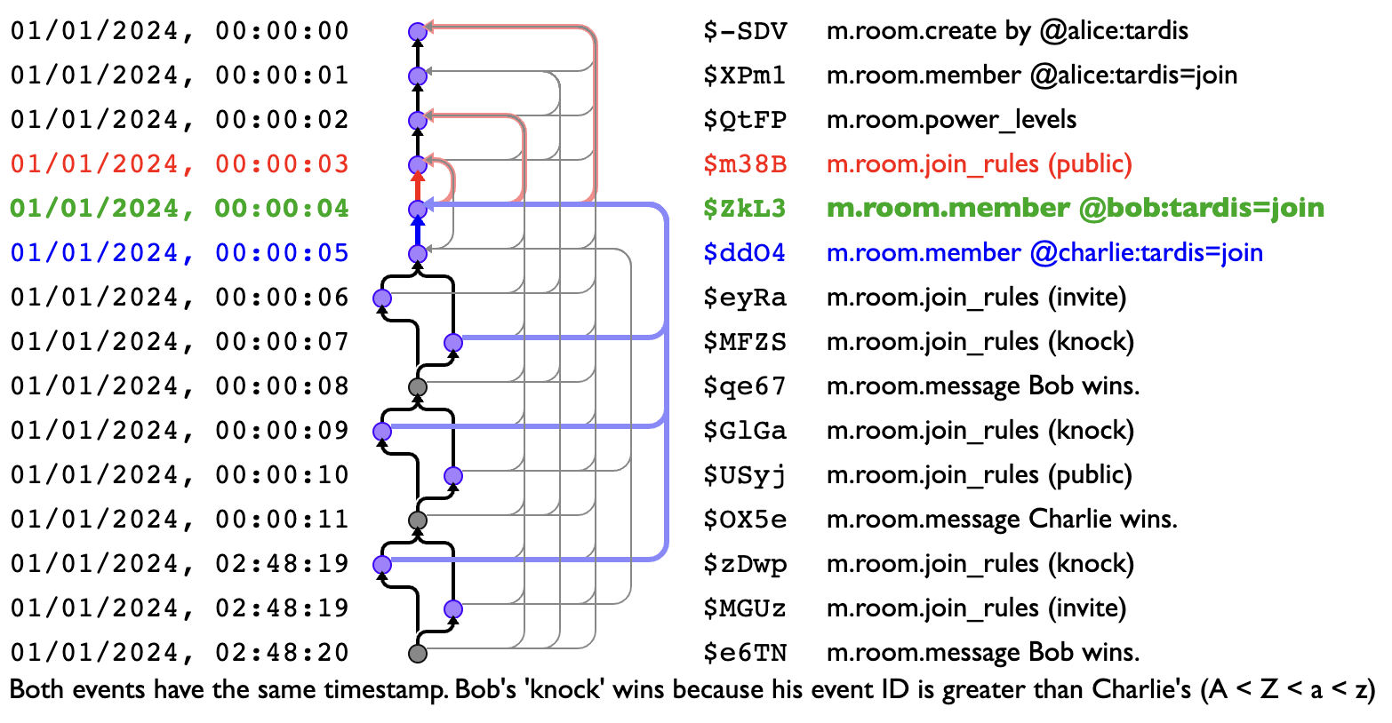 Meanwhile, the other big new project on the horizon is State Resolution v3. Old-timers may remember that when we launched Matrix 1.0, one of the big changes was the arrival of State Resolution v2 (MSC1442), which fixed various nasty issues in the original merge conflict resolution algorithm Matrix uses to keep servers in sync with each other. Now, State Res v2 has subsequently served us relatively well (especially relative to State Res v1), but there have still been a few situations where rooms have state reset unexpectedly – and we’re currently in the process of chasing them down and proposing some refinements to the algorithm. There’s nothing to see yet, although part of the work here has been to dust off TARDIS, our trusty Time Agnostic Room DAG Inspection Service, to help visualise different scenarios and compare different resolution algorithms. So watch this space for some very pretty explanations once v3 lands!