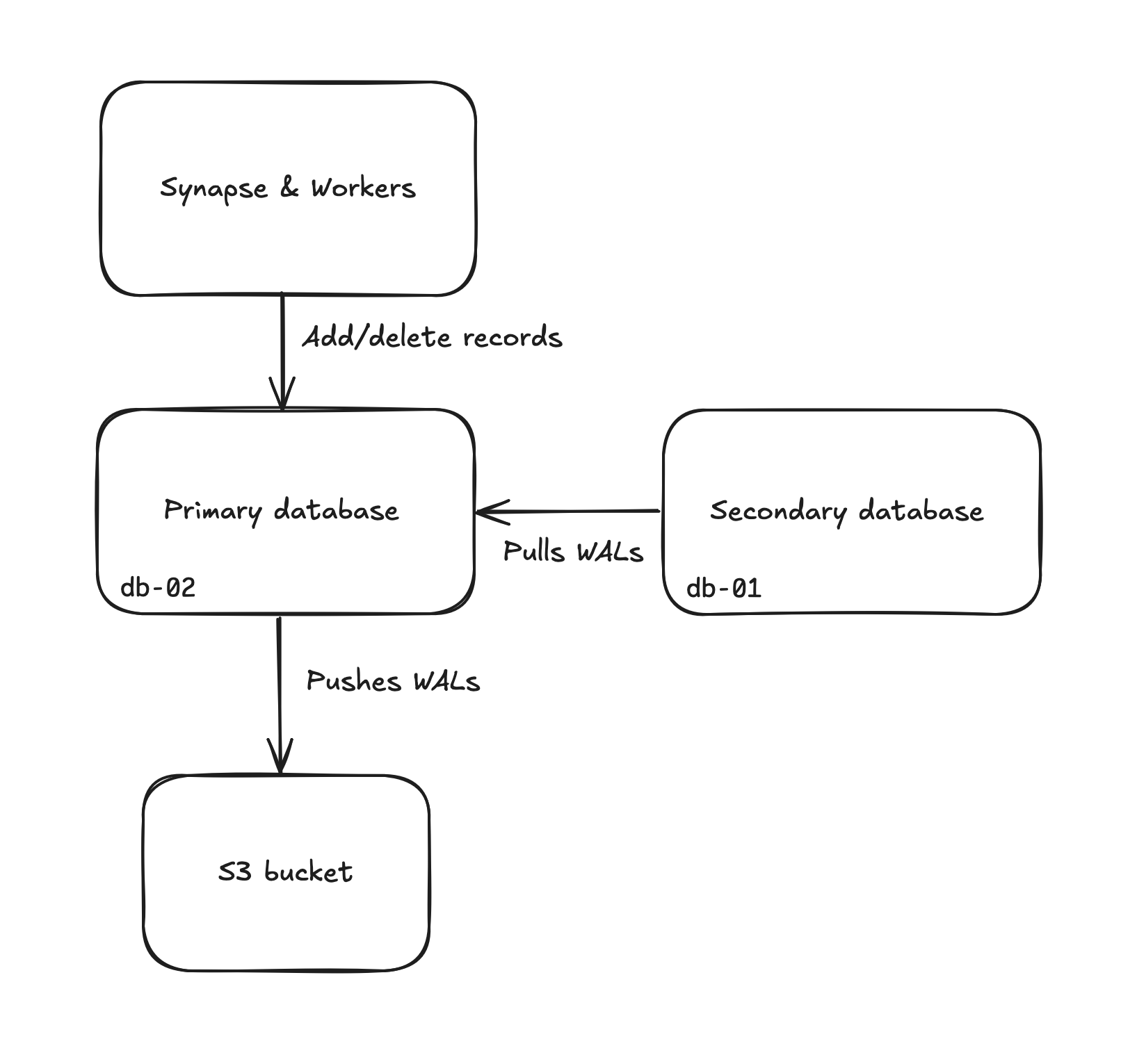 The matrix.org homeserver is made of a main Synapse instance with hundreds of workers, backed by a single logical Postgres cluster made up of two machines. The primary database is replicated to a secondary, read-only instance via streaming replication.