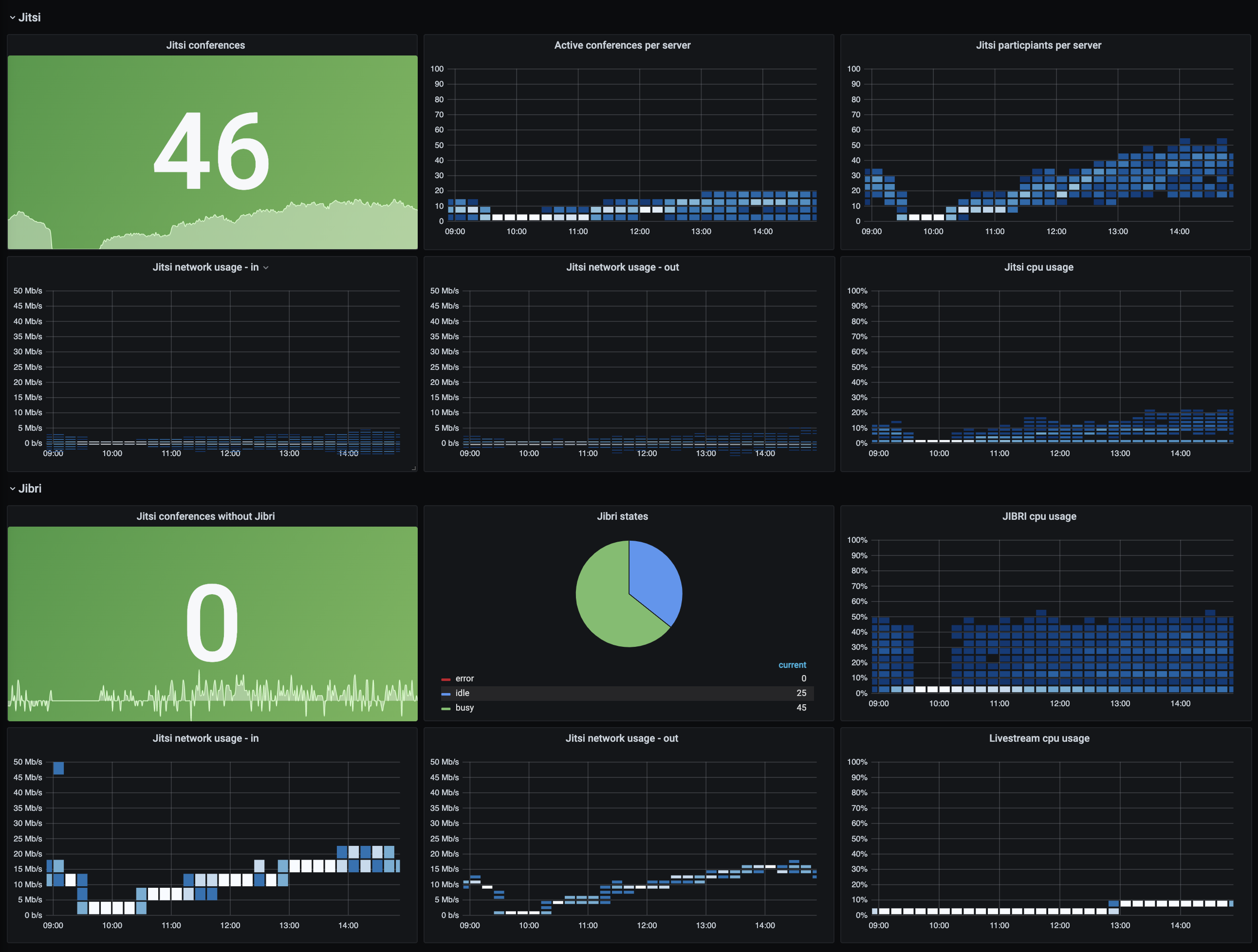 Here's a screengrab of the Jitsi/Jibri Grafana dashboard during the first day of the conference, showing 46 concurrent conferences in action, with 25 spare jibris in the scaling group cluster ready for action if needed :)