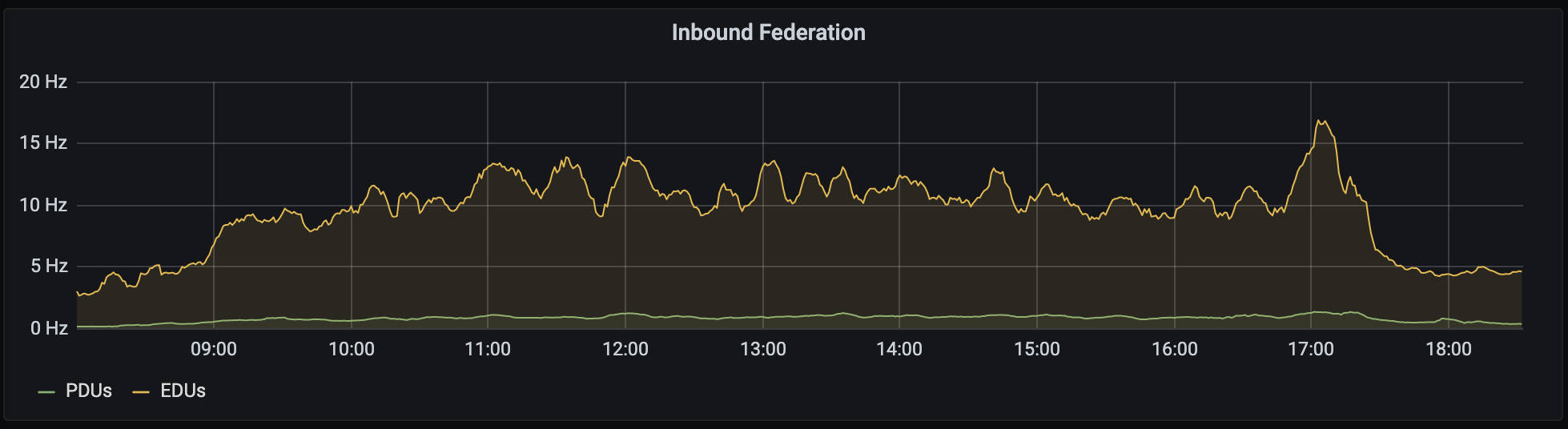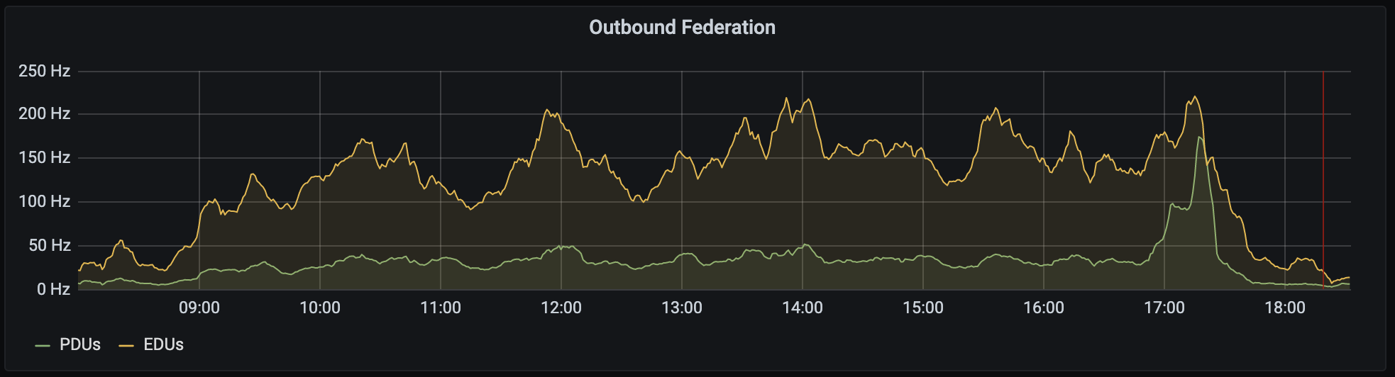 That said, we did have some production incidents which impacted the event. The most serious one was on Saturday morning, where it transpired that some of the endpoints hosted on the main Synapse process were taking way more CPU than we'd anticipated - most importantly the /groups endpoints which handle traffic relating to communities (the legacy way of defining groups of rooms in Matrix). One of the last things we'd done to prepare for the conference on Friday night was to create a +fosdem:fosdem.org community which spanned all 1000 public rooms in the conference, as well as add the +staff:fosdem.org community to all of those rooms - and unfortunately we didn't anticipate how popular these would be. As a result we had to do some emergency rebalancing of endpoints, spinning up new workers and reconfiguring the loadbalancer to relieve load off the main process.