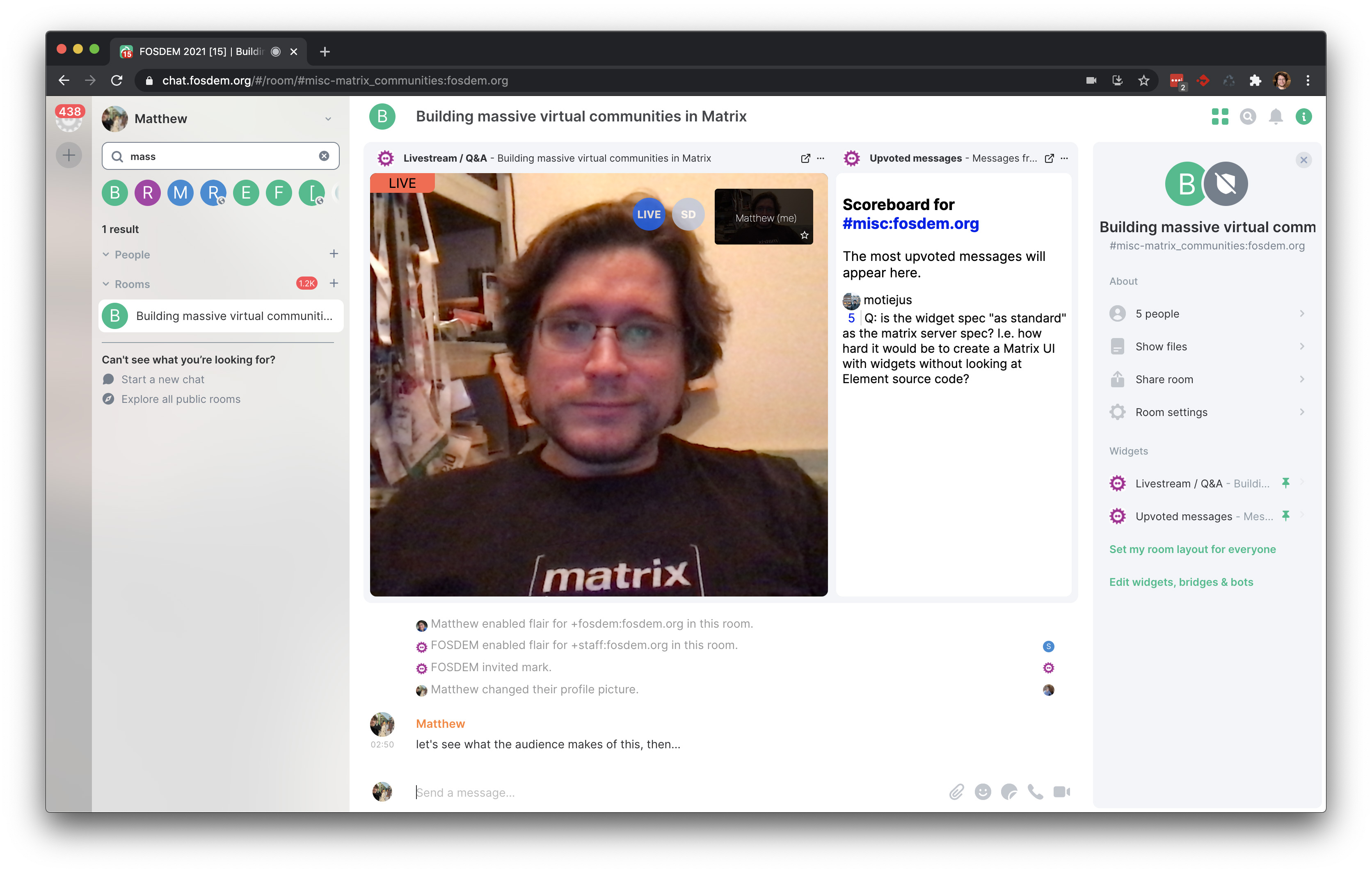 The widgets themselves were hosted by the bot (you can see them at https://github.com/matrix-org/conference-bot/tree/main/web). Meanwhile the chat.fosdem.org webclient itself ended up being identical to mainline Element Web 1.7.19, other than FOSDEM branding and being configured to hook the 'video call' button up to the hybrid Jitsi/livestream widget rather than a plain Jitsi.