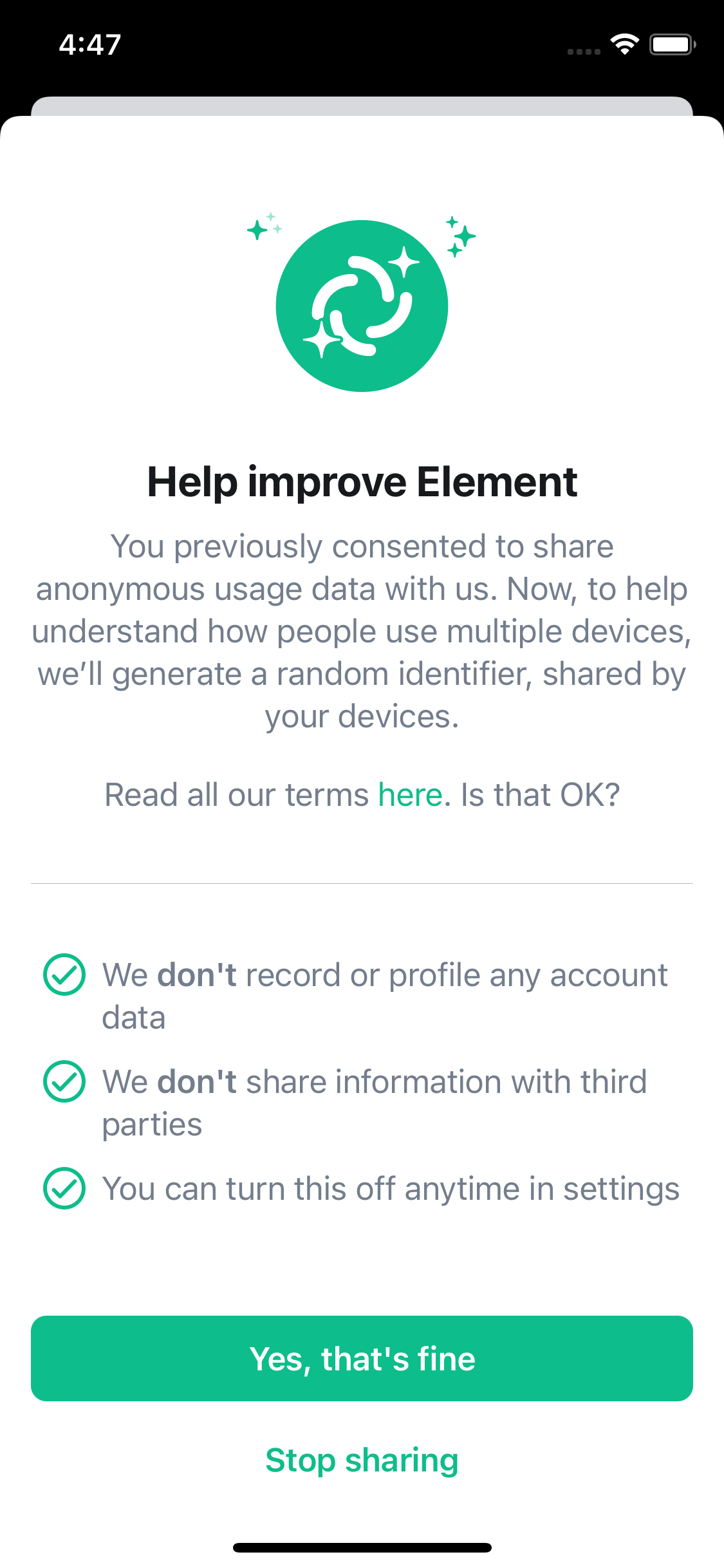 • You can now opt in to sending anonymous analytics data in the user settings on all platforms. Please enable it in the β€œSecurity & Privacy” menu, under β€œAnalytics” to help us understand better how Element apps are used.