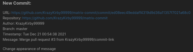 • Added support for the following message types: TEXT, EMOTE, NOTICE, IMAGE, FILE, AUDIO, VIDEO